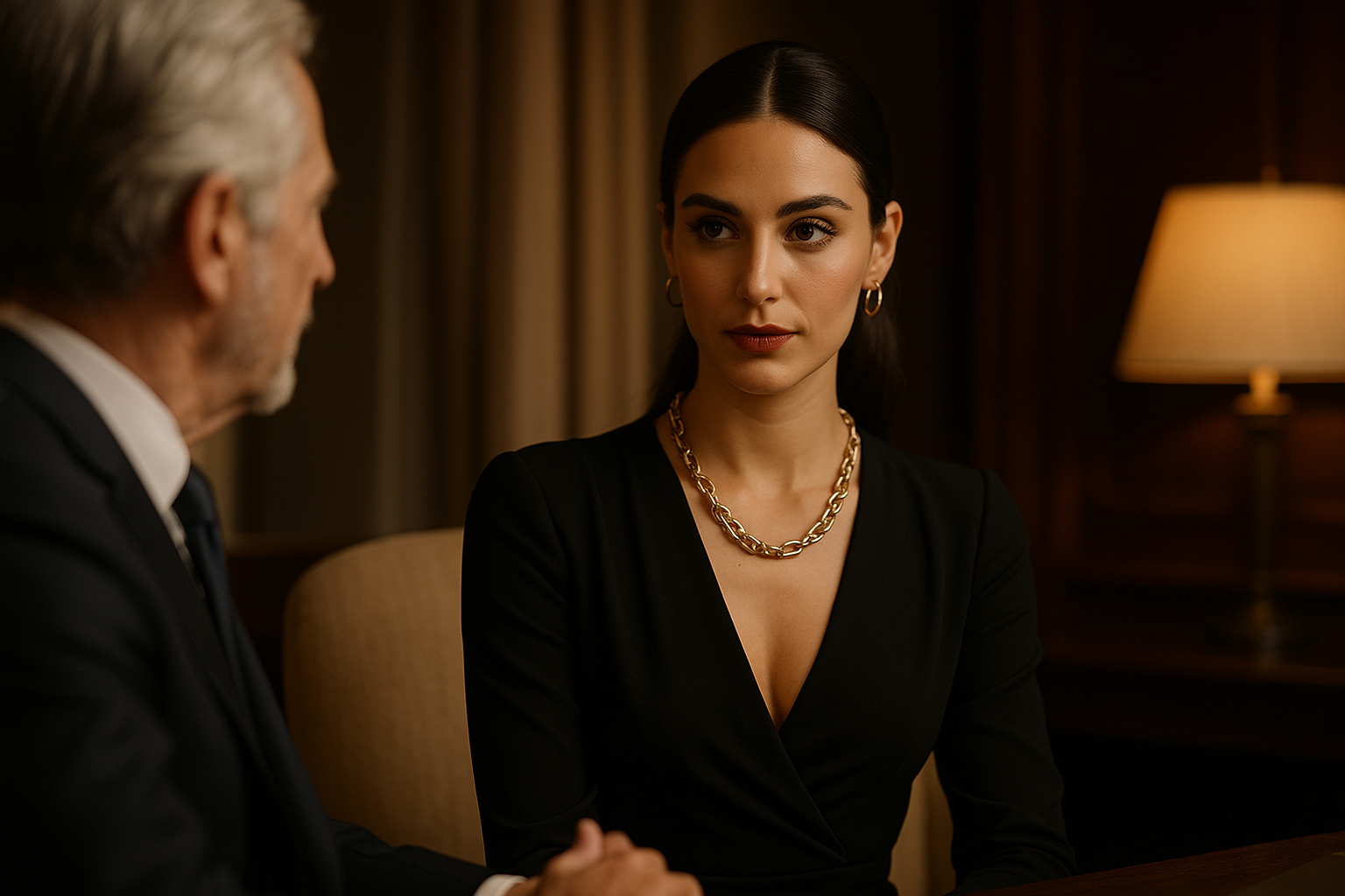 She must look like she belongs, no matter what room she is in. Beyond that, she should look like she is a prize, even next to this man. Other women should look at her with admiration. Other men should eye her with desire and want an introduction. Everyone around should compliment the man for having found such a lovely creature to be by his side.